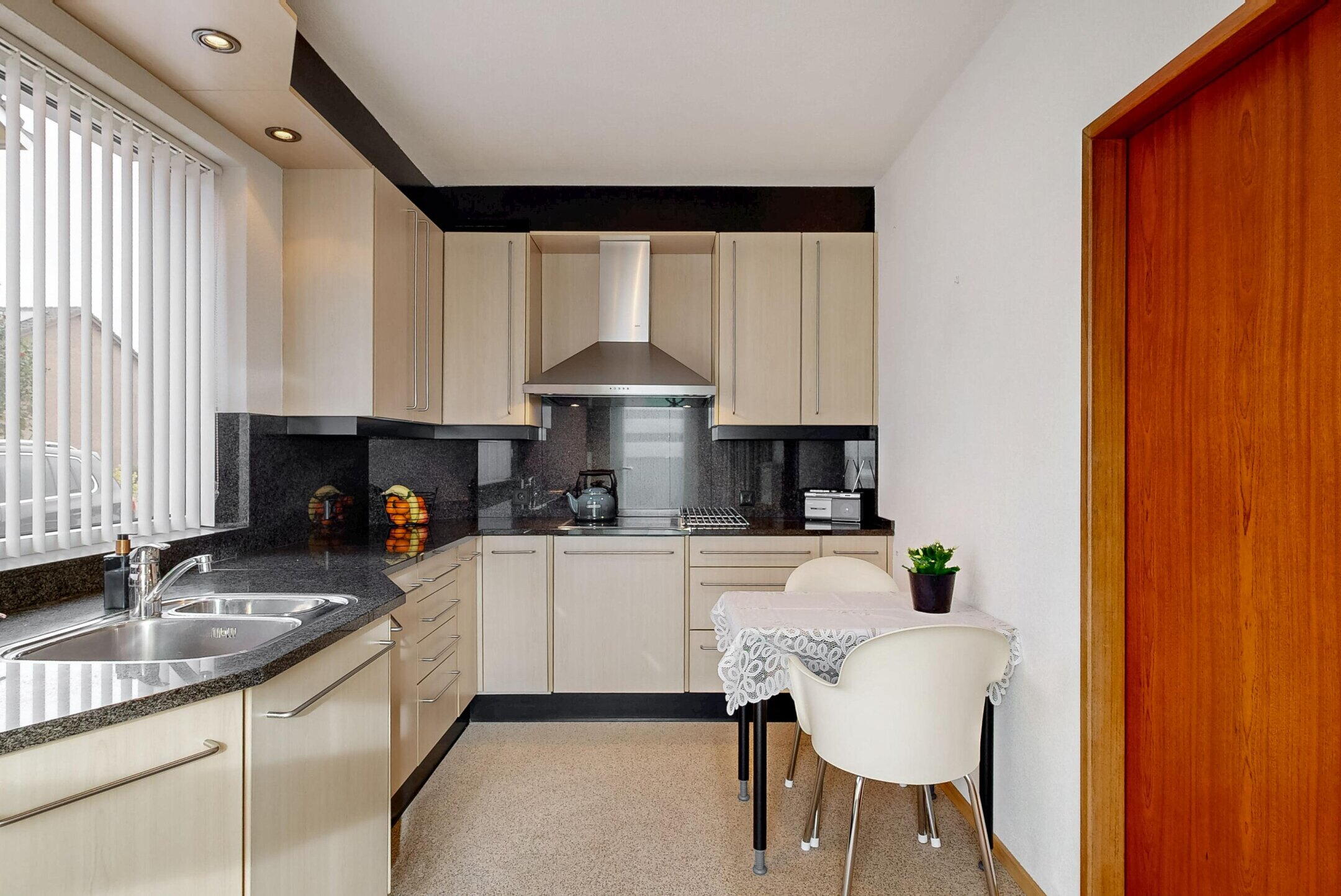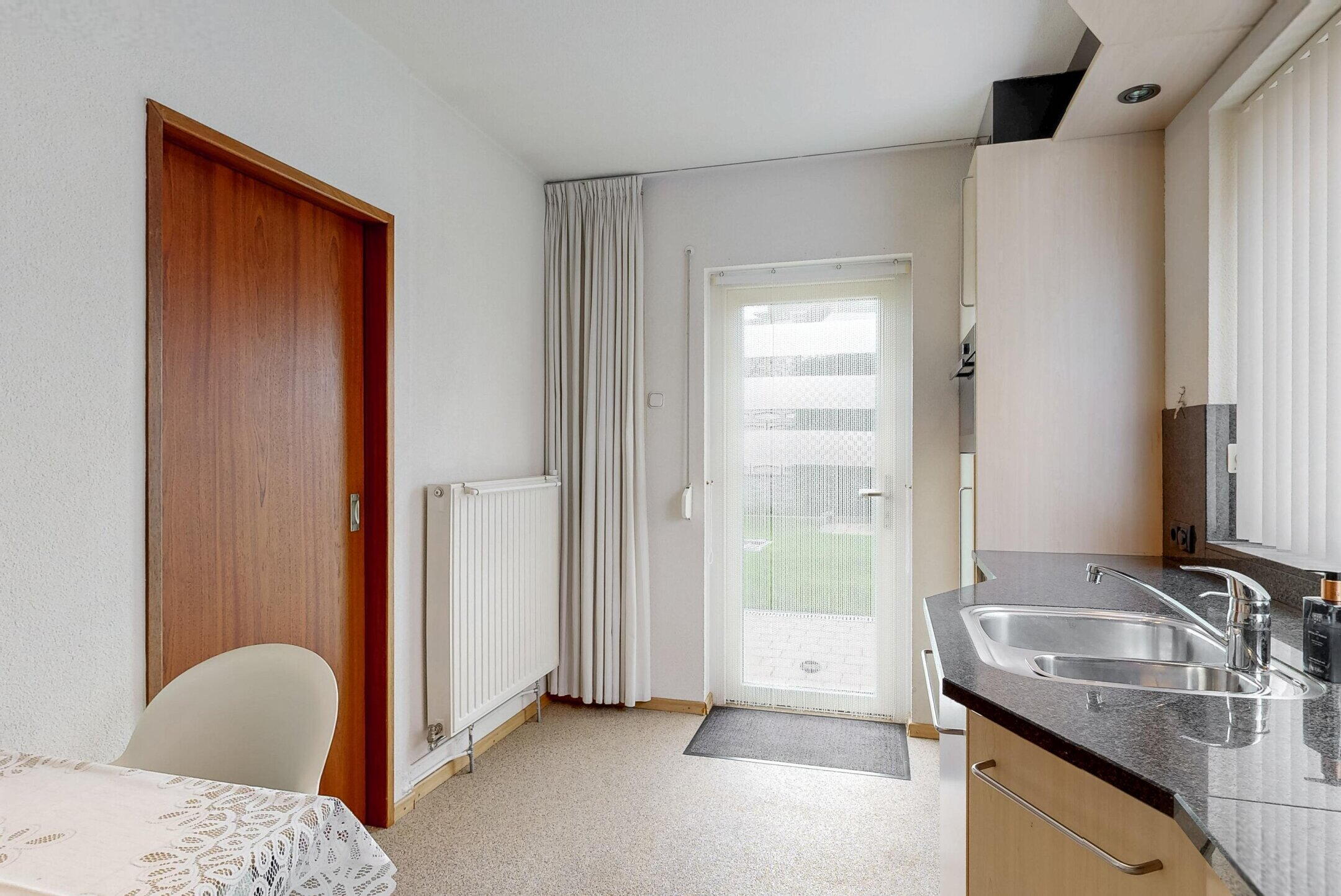 Aan de achterzijde bevindt zich de gesloten keuken (ca. 11m²), waar gemakkelijk een kleine ontbijttafel past. De keuken is enigszins gedateerd, echter zeer netjes onderhouden en voorzien van grote L-opstelling met een granieten werkblad en o.a. een combi-oven (redelijk recent vernieuwd), vaatwasmachine, elektrische boiler (eigendom, direct warm water), kookplaat (inductie), afzuigkap, spoelbak en koelkast. De keuken is net als de woonkamer voorzien van een grindvloer, die gemakkelijk in het onderhoud is. Vanuit de keuken is er een deur naar de achtertuin en de tussenmuur met de woonkamer zou theoretisch open gebroken kunnen worden, zodat er een open geheel ontstaat met de woonkamer. De kunststof ramen en deuren zijn voorzien van HR++ glas en grotendeels van rolluiken.
