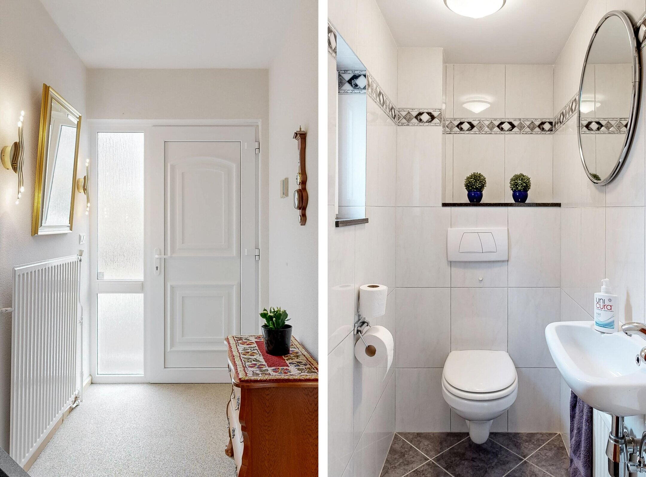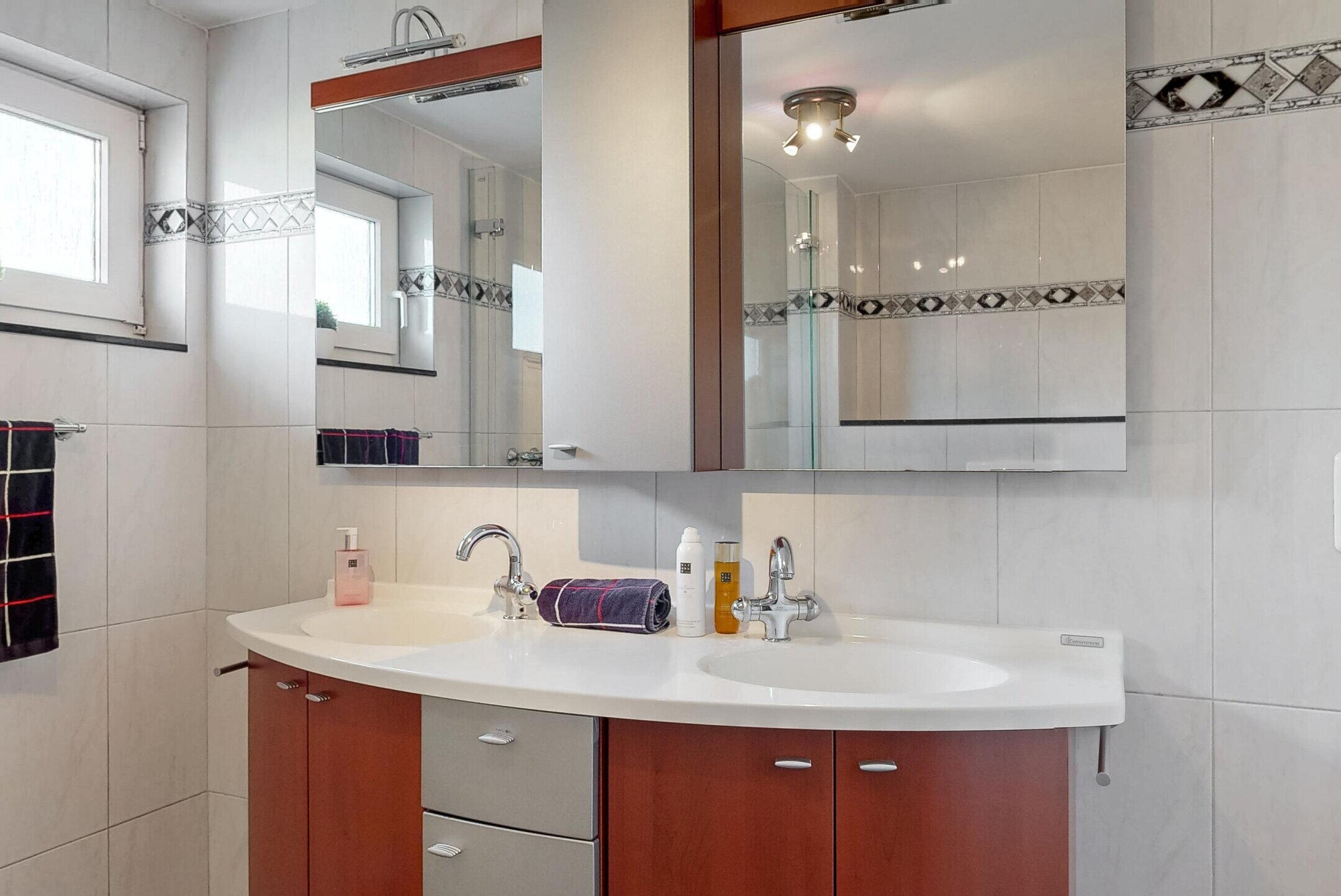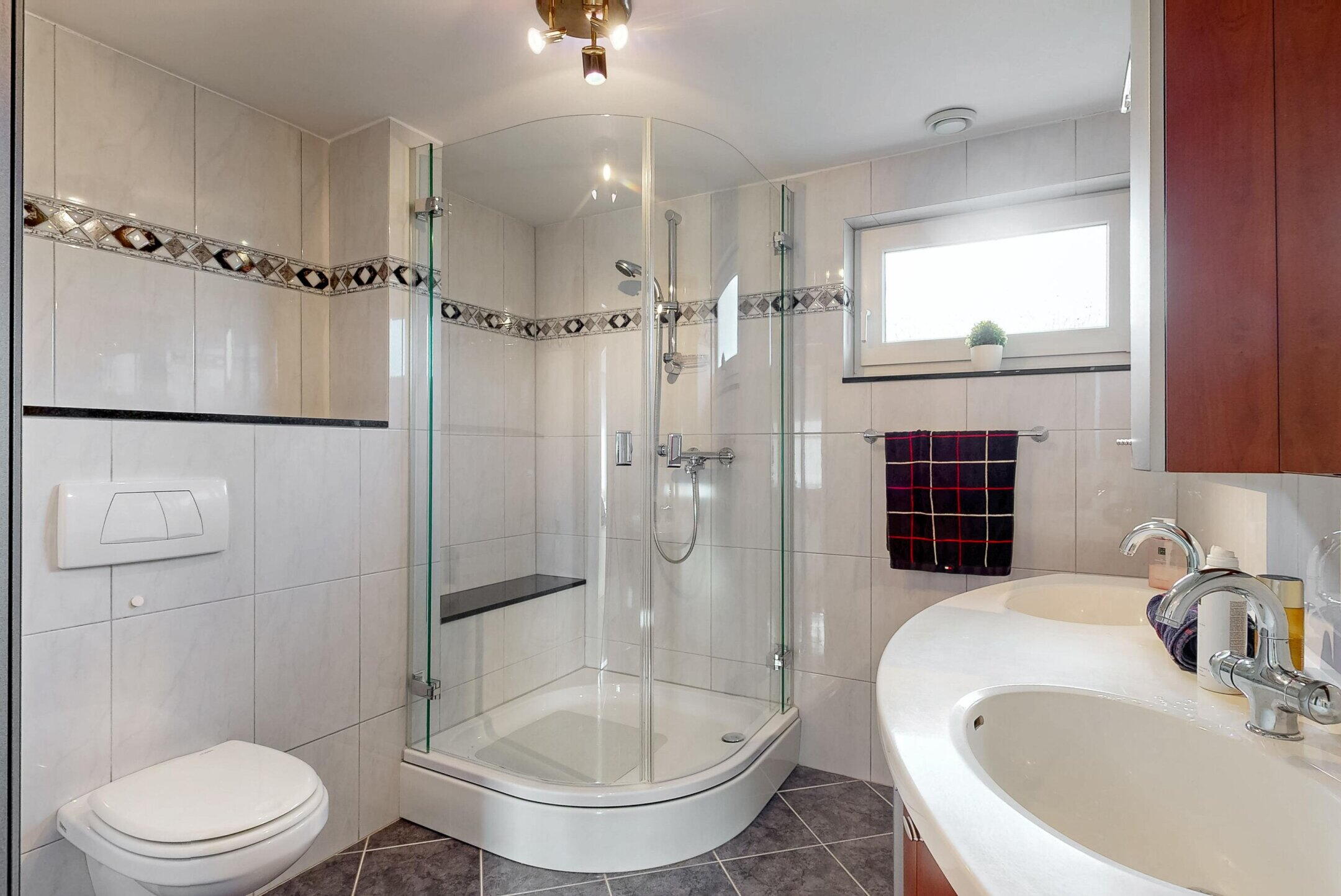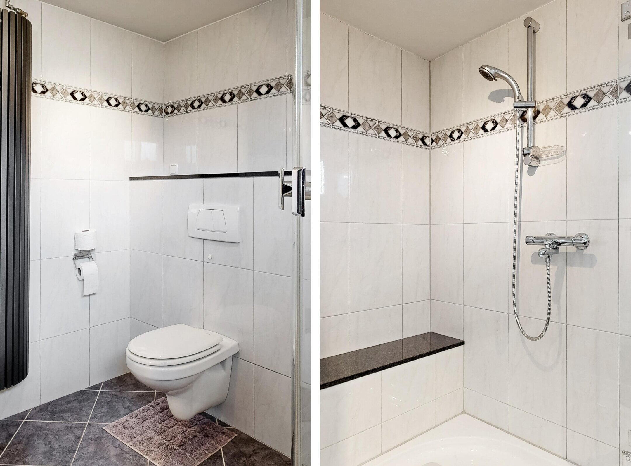 - Toilet, douche, dubbele wastafel