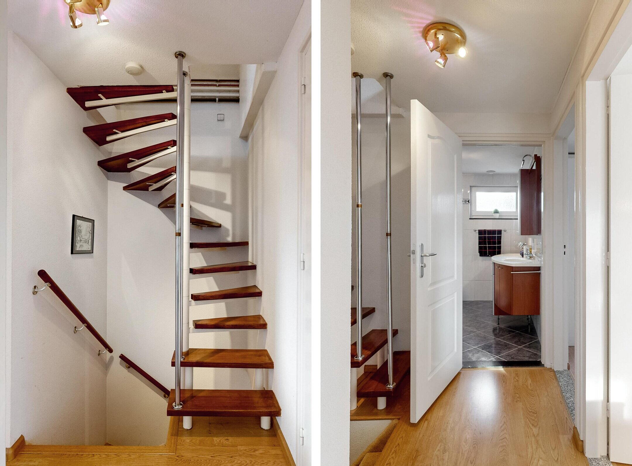 Het toilet bevindt zich op weg naar de 1e verdieping op een kleine verhoging, 2 trapjes vanaf begane grond, voorzien van een zwevend toilet met fonteintje.