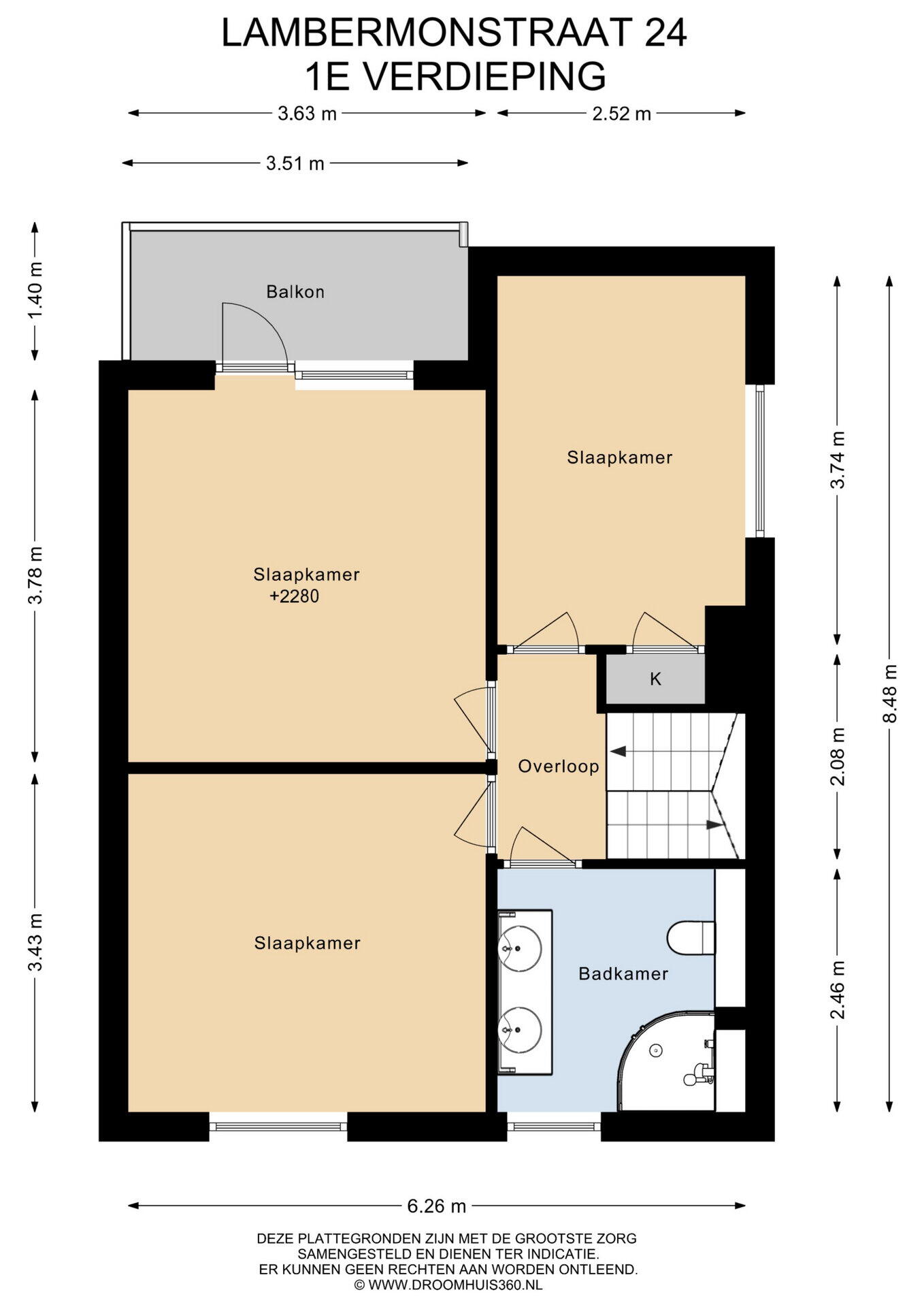 De eerste verdieping beschikt over vier kamers, waaronder drie slaapkamers en een badkamer, allen bereikbaar via de overloop. De hoofdslaapkamer (ca. 14m²) bevindt zich aan de achterzijde van de woning en biedt voldoende ruimte voor een tweepersoonsbed en een royale kledingkast. Vanuit deze kamer is er toegang tot het balkon van circa 5 m². De tweede slaapkamer (ca. 9m²), eveneens aan de achterzijde, is ideaal te gebruiken als kinder- of werkkamer. De derde slaapkamer (ca. 12 m²) bevindt zich aan de voorzijde en heeft een prettig uitzicht op de straatzijde en is net als alle andere slaapkamers en overloop, voorzien van een nette laminaatvloer. De slaapkamers aan de achterzijde zijn bovendien voorzien van rolluiken.